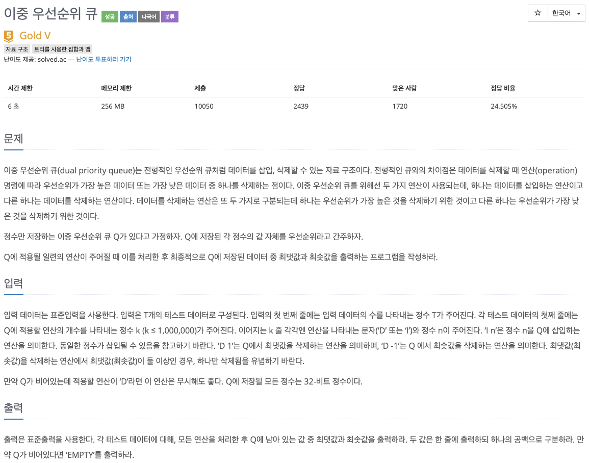 바로 연산마다 키 값을 부여하고 value를 k값과 함께 저장하는 방법이다. 그리고 삽입이 이루어질 때마다 다른 힙에서 해당 수가 빠진 수인지 아닌지를 검사하는 방법이다. 이렇게 작성하여 제출하니 9012ms의 시간으로 통과했다.