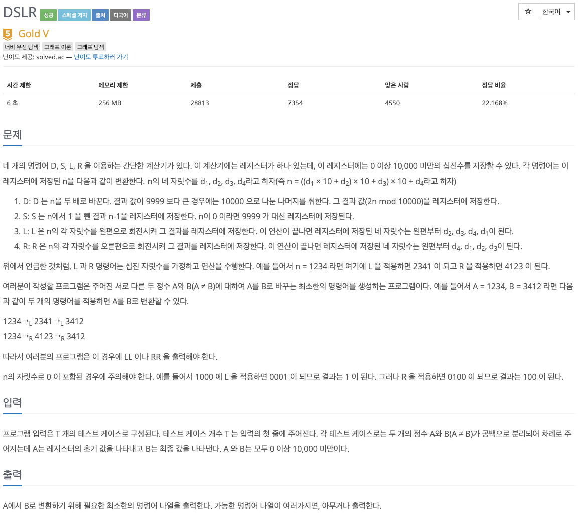 문제 자체는 BFS로 풀어야 한다는 것만 알게 되었다면 그닥 어렵지 않다. DSLR계산하는 함수를 하나 정의해놓고 BFS를 돌리면서 해당 값에 도달하기 까지의 경로를 저장하면 된다.