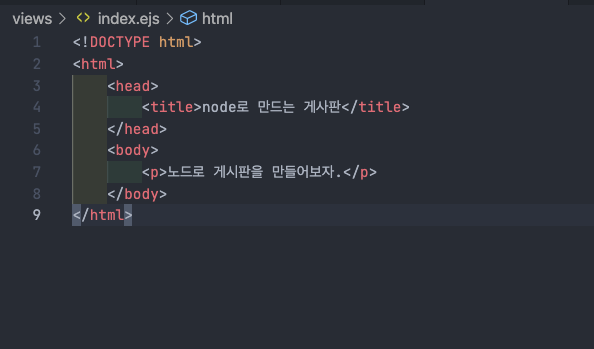 views폴더에 index.ejs를 만들고 간단한 내용을 작성한 뒤 잘 돌아가는지 서버를 켜서 확인해본다.