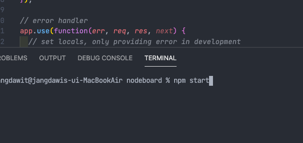 먼저 터미널에서 명령어를 통해 express generator로 프로젝트 폴더를 빠르게 생성하고, npm install 명령어로 필수적인 모듈들을 빠르게 설치한다.