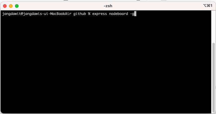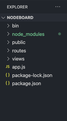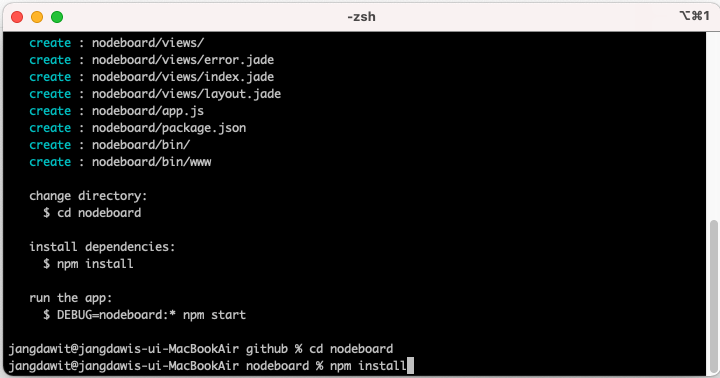 먼저 터미널에서 명령어를 통해 express generator로 프로젝트 폴더를 빠르게 생성하고, npm install 명령어로 필수적인 모듈들을 빠르게 설치한다.