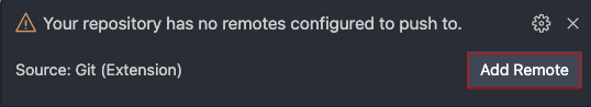 푸쉬를 하려고 하면 repository를 설정하지 않았기 때문에 오류가 발생한다. Add Remote를 통해 리포지토리를 만들고 푸쉬하면 된다.