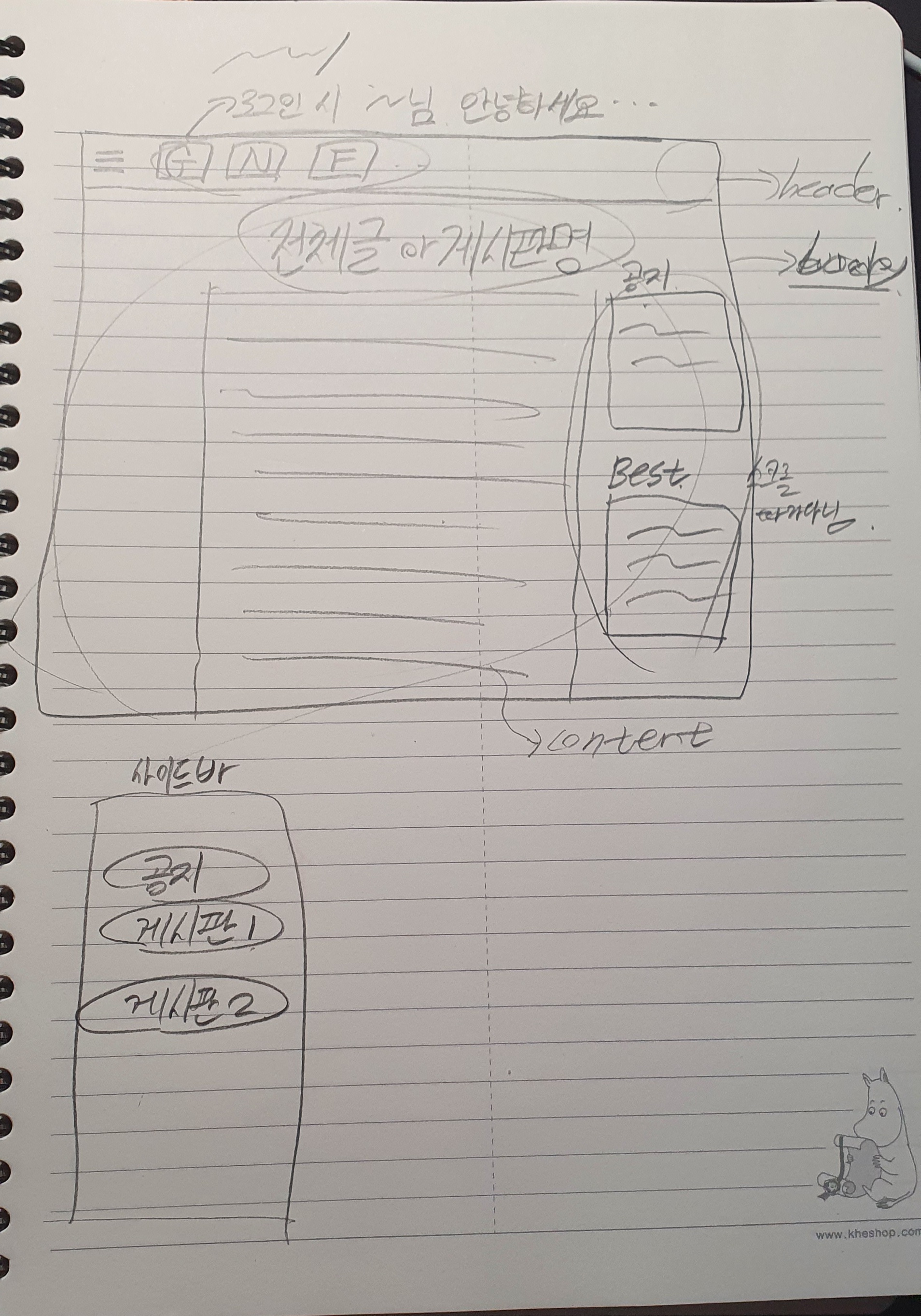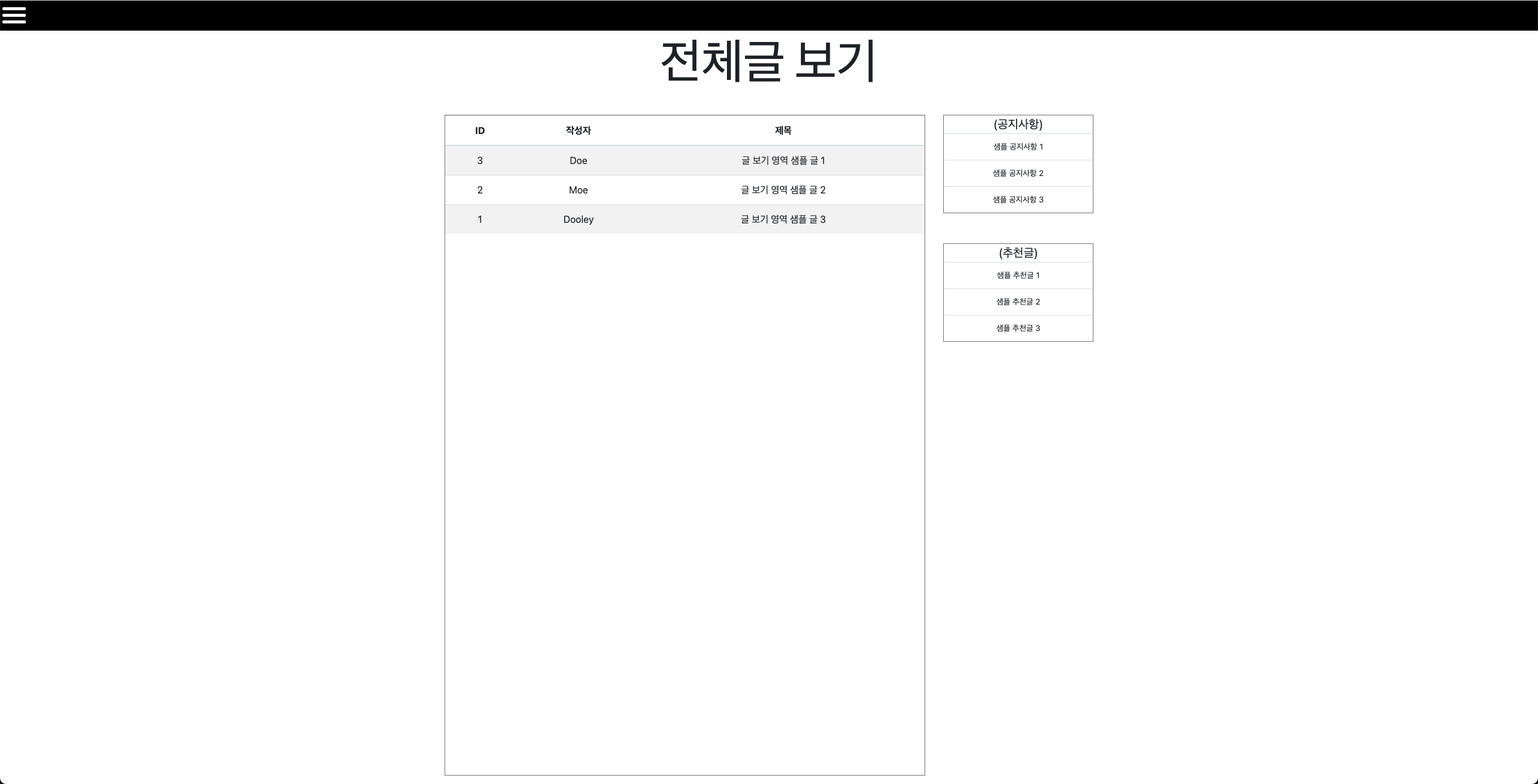 대충 이런식으로 상단 네비게이션 바에 사이드바를 부르기 위한 햄버거 버튼과 소셜 로그인 버튼들, 그리고 하단 왼쪽 부분에는 게시글을, 오른쪽 부분에는 공지와 추천글들을 보여주는 형태로 만들길 바라고 있다.