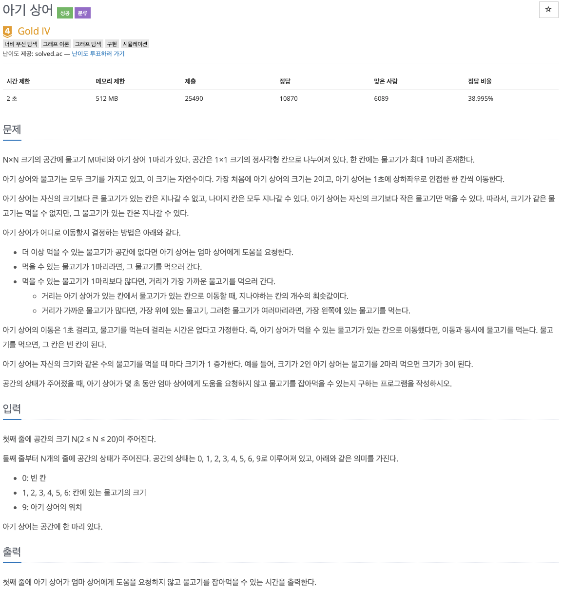 이 문제를 해결하기 위해 최단거리에 있는 물고기를 발견했을 경우, 최단거리에 있는 모든 먹을 수 있는 물고기를 찾고, 그중 가장 위 왼쪽에 있는 물고기를 먹기 위한 분기를 해야 한다.