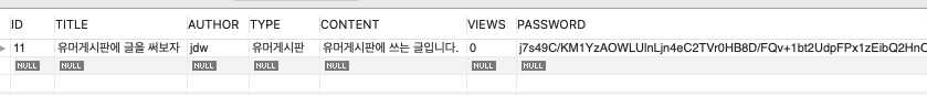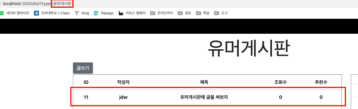 글쓰기를 클릭하면 이렇게 유머게시판에 글이 써지면서 해당 게시판 조회로 넘어가는 것을 확인할 수 있다.