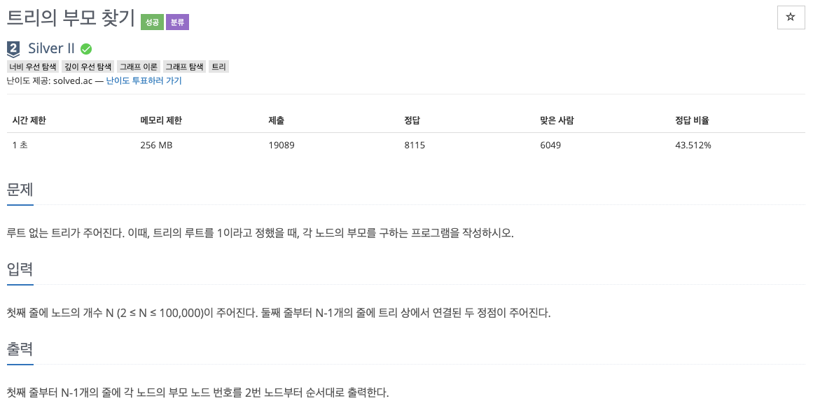 핵심적인 생각은, 노드를 받고 각각의 노드 마다 자신이 어떤 노드와 연결되었는지를 저장한 뒤에, 1번 노드부터 시작해서 자신과 연결된 노드를 자식 노드로 설정하고, 그 뒤부터는 DFS혹은 BFS를 돌리면서 계속 자신이 연결된 노드(이미 부모 노드가 정해진 노드 제외)를 자식 노드로 삼으면된다.