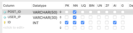 POST_ID에는 해당 글의 ID가 들어가고, USER_IP테이블에는 추천한 유저의 IP가 담긴다.