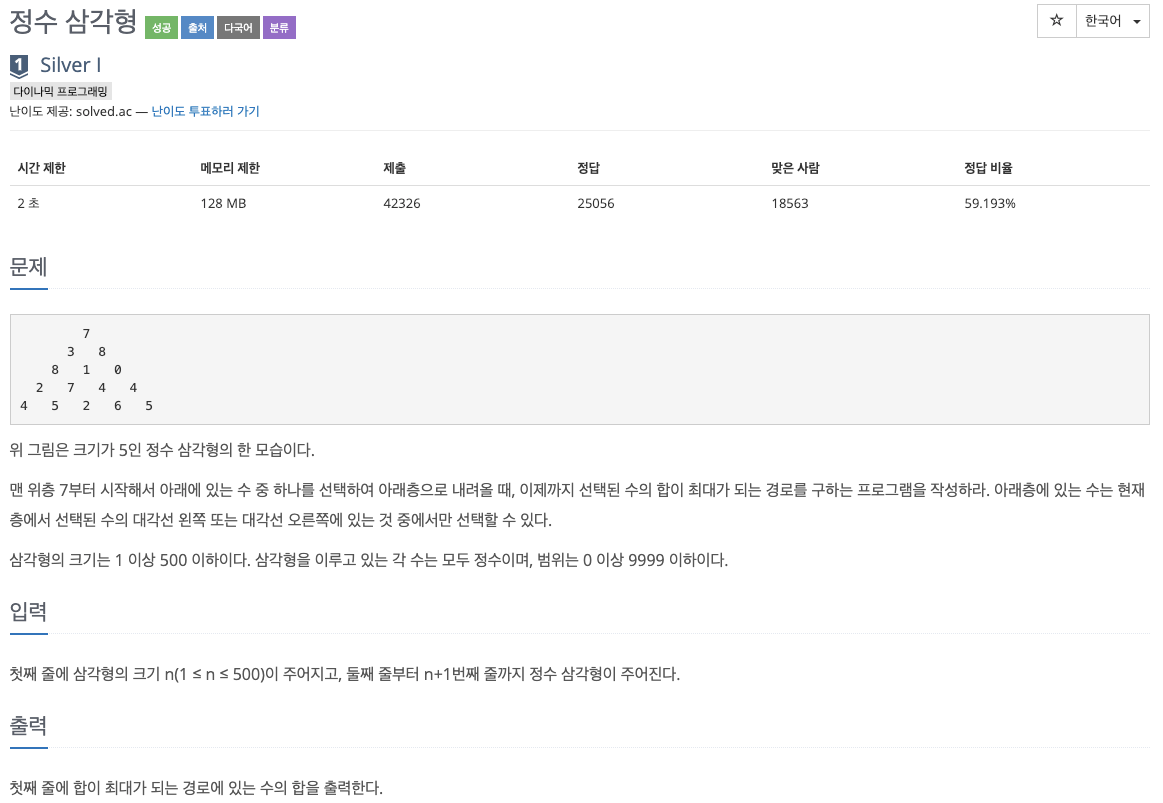이 문제는 약간 고정관념이 있으면 풀기 힘든 것 같다. 피라미드를 꼭대기부터 브루트포싱으로 모든 경로를 탐색하며 푼다면 무조건 시간 초과가 뜬다. 내가 바로 처음에 이짓을 했다.