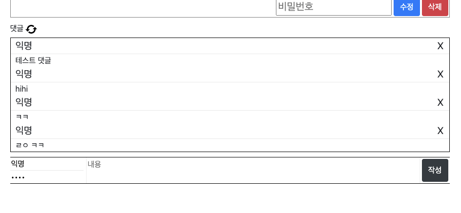 deleteReply는 댓글의 password를 prompt로 받아서 일치하는지 확인하고 댓글을 삭제하는 기능을 담당한다. 그리고 삭제가 완료되었다면 댓글 리스트를 한번 refresh한다. 여기서 prompt로 비밀번호를 입력할 때 * 로 보이게 하고 싶었는데 어떻게 하는지 도저히 못 찾겠어서 그냥 진행했다.