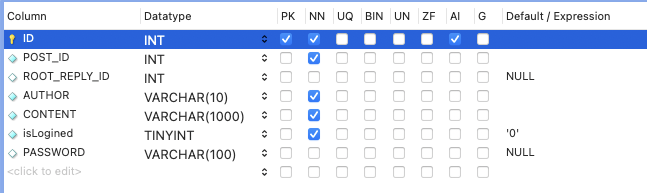 먼저 댓글을 위한 REPLY 테이블을 DB에 만들어야 한다. REPLY 테이블의 COLUMN은 다음과 같다.