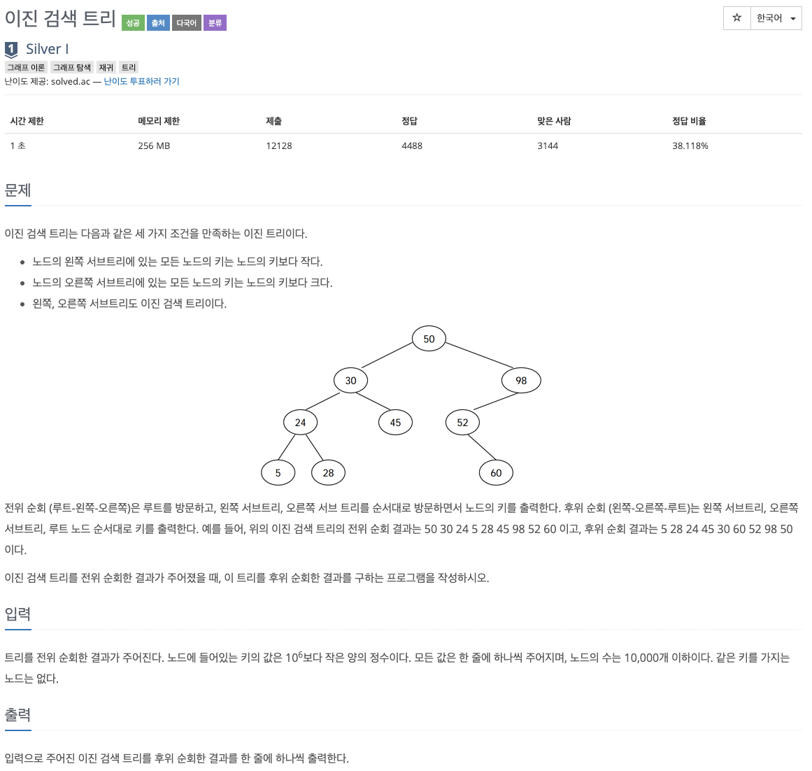 트리를 그냥 주는게 아니라 전위 순회한 결괏값을 주기 때문에 처음에 나는 먼저 트리를 구현->후위 순회를 하는 코드를 작성했다.