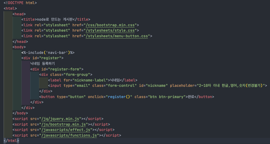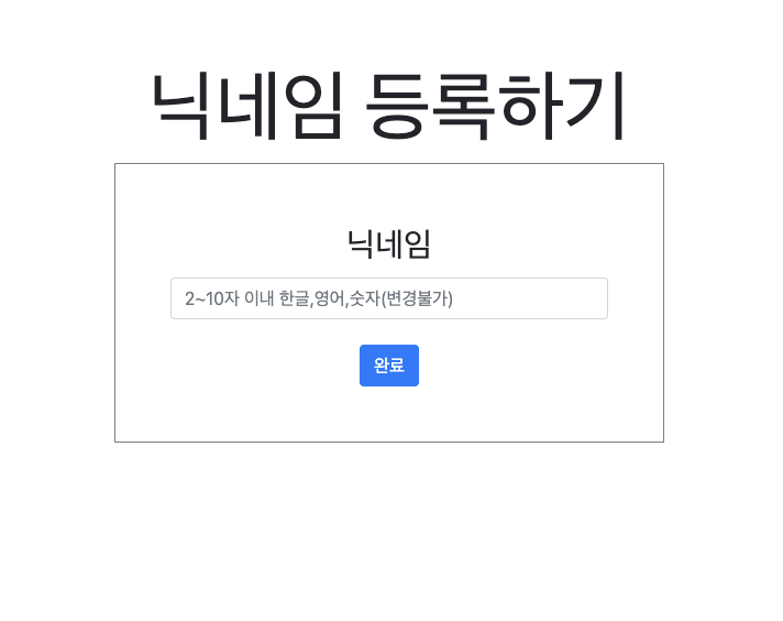 닉네임 등록하기의 '완료' 버튼을 눌렀을 때 실행되는 register함수이다. 입려값에 공백이 들어갔거나 특수기호, 혹은 한글 자모음만 들어갔다면 생성을 막는다. 또한 2~10자를 벗어났을 때에도 생성을 막는다.