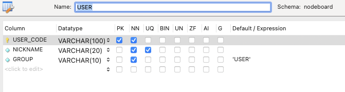 유저 정보를 담을 user테이블의 Column으로는 구글로 로그인 했을 시 넘어오는 id값을 저장할 USER_CODE와 NICKNAME,그리고 해당 유저의 등급(ADMIN,USER)를 저장할 GROUP을 지정한다. 여기서 nickname을 Unique 값으로 지정해서 같은 닉네임으로 insert하려고 하면 오류를 발생시키도록 한다.