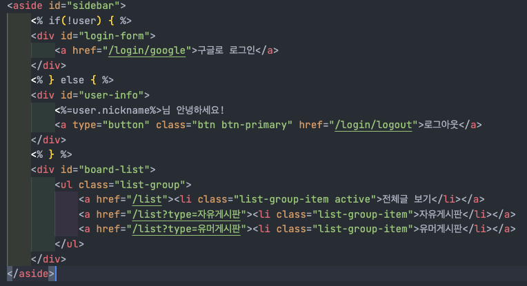 사이드바에서는 user값의 유무에 따라 로그인 버튼을 띄울 것인지 회원 정보를 띄울 것인지를 분기한다.