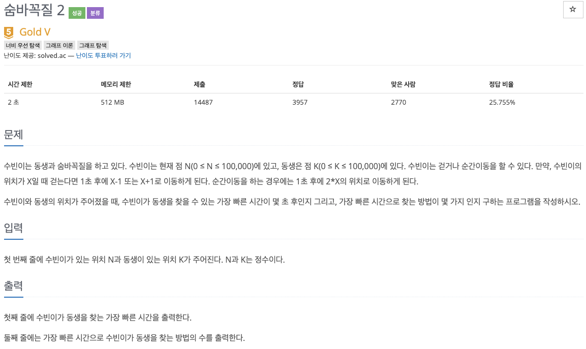 숨바꼭질 1 문제를 푼 기억이 있어서 2도 엄청 쉽게 풀 수 있을 줄 알았는데 착각이었다.. 1과의 차이점은 최단시간으로 가는 서로 다른 최단경로가 몇가지 있는지까지 찾아야 하는 것인데, 이게 생각보다 쉽게 찾아지지가 않았다.