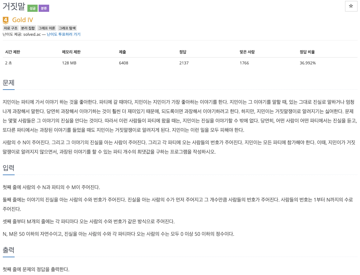 이 문제를 풀기 위해서는 그룹을 묶어야 한다. 일단 처음에 진실을 알고 있는 사람의 집합을 만든다.