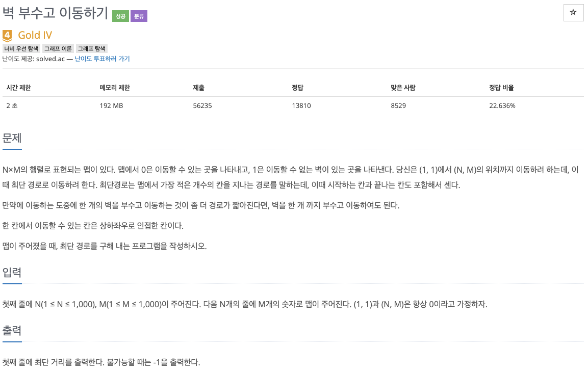 말 그대로 벽을 부수며 이동할 수 있는 문제이다. 벽은 단 한번만 부술 수 있다.