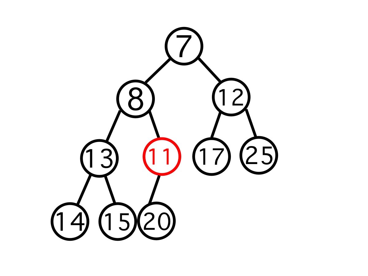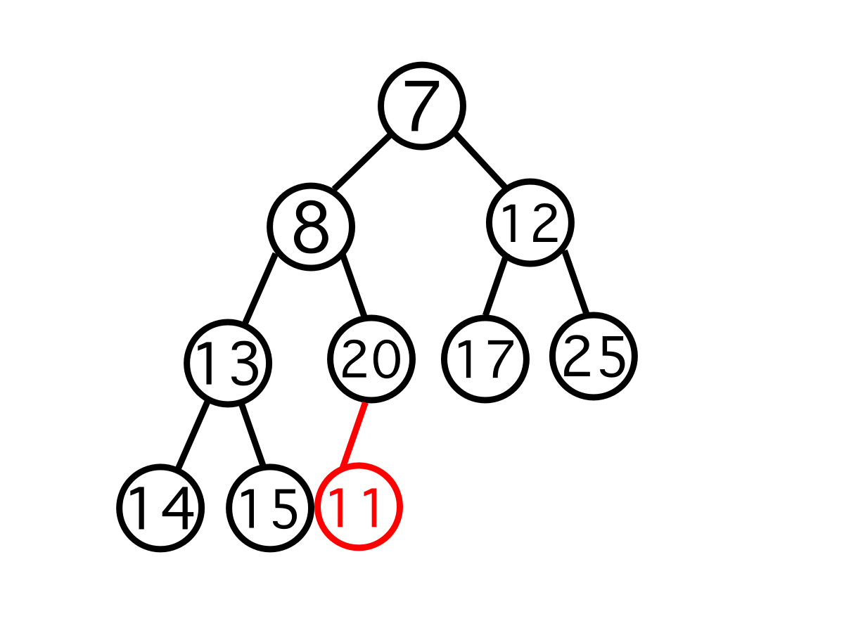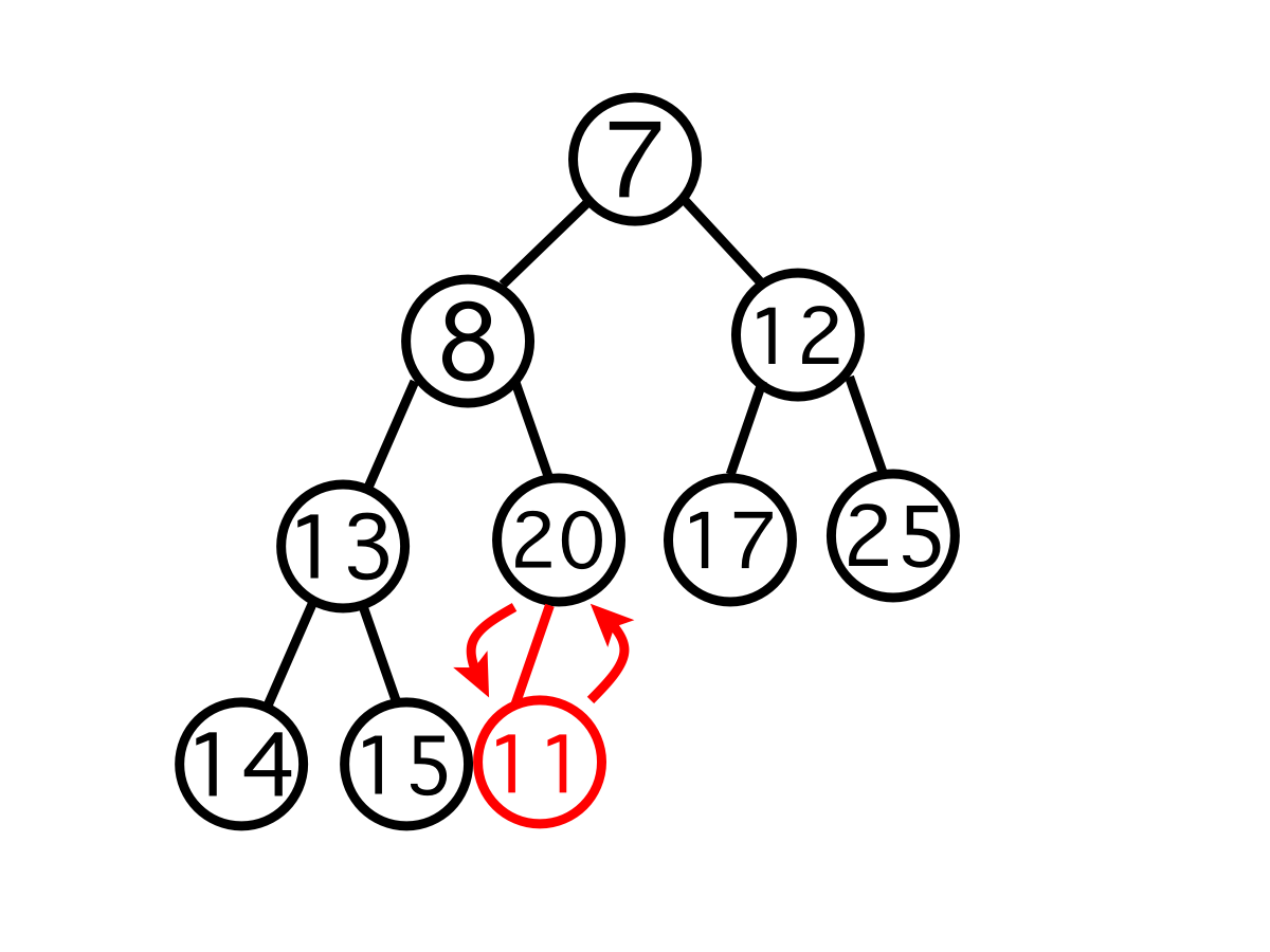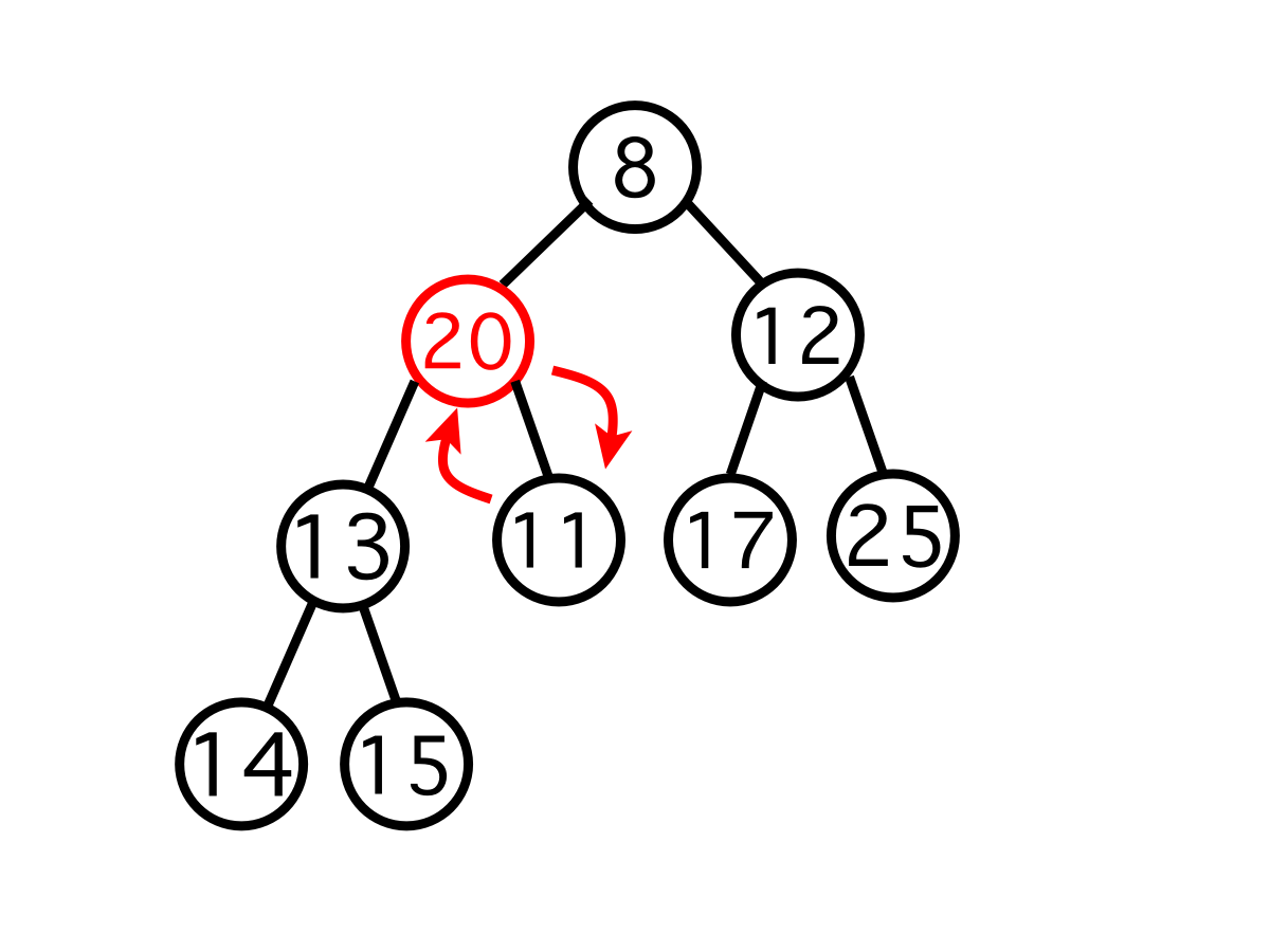 자신의 부모 노드와 자신 사이의 우선순위를 비교한다. 여기서는 11이 우선순위가 높으므로(값이 더 작으므로) 20과 자리를 교체한다.