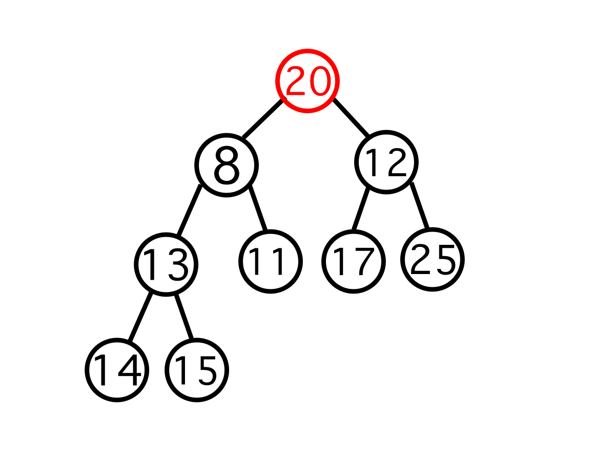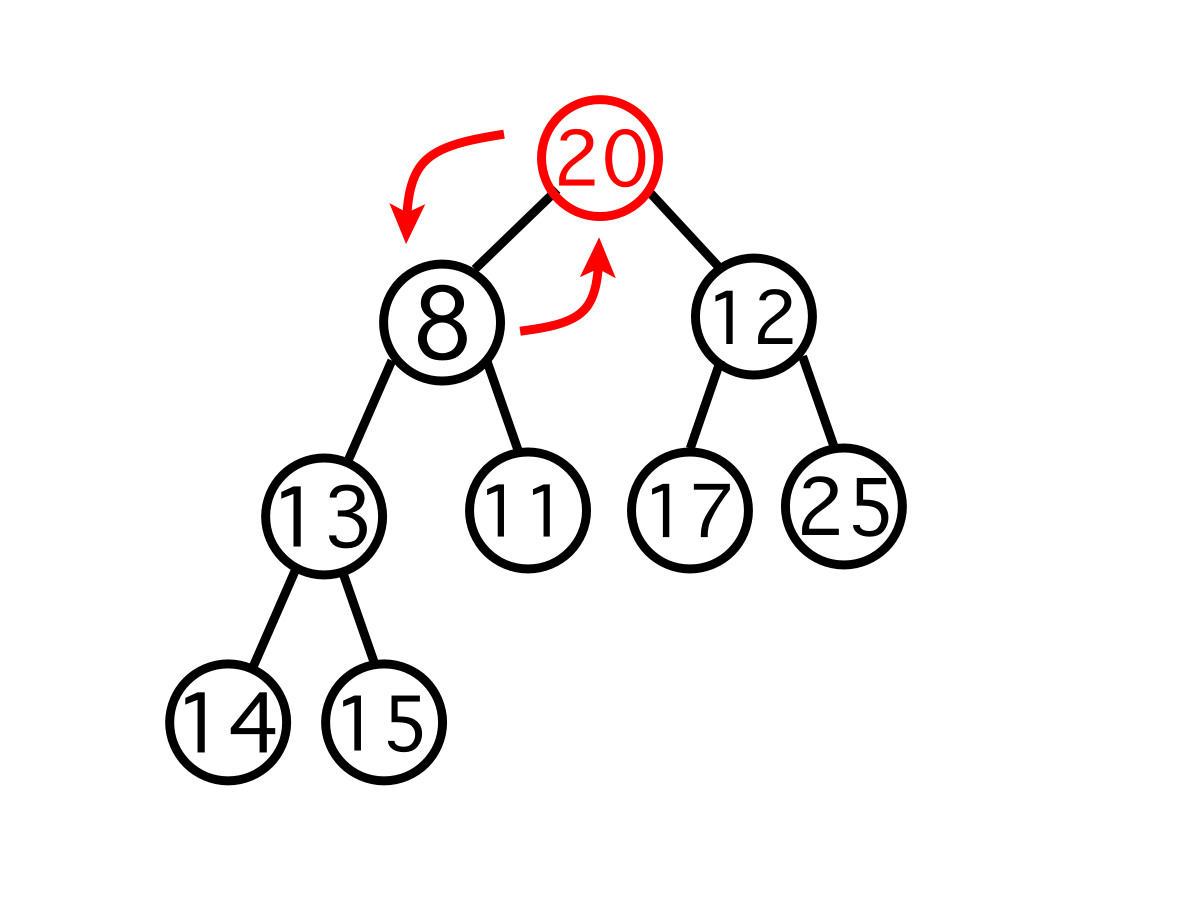이때 두 자식 노드 중 우선 순위가 높은(여기서는 수가 더 적은) 자식 노드와 자리를 교체해야 한다. 그래야 교체 후에 해당 노드가 비교 대상이었던 다른 노드보다 교체 후에 부모 노드가 된 뒤에도 우선 순위가 높다.