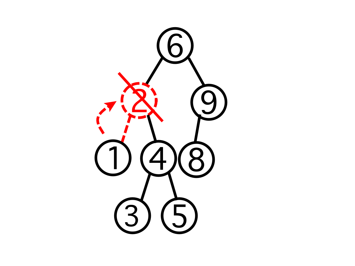 이렇게 생긴 이진 탐색 트리에서 2를 삭제한다고 하면, 2에는 두 자식이 있다.