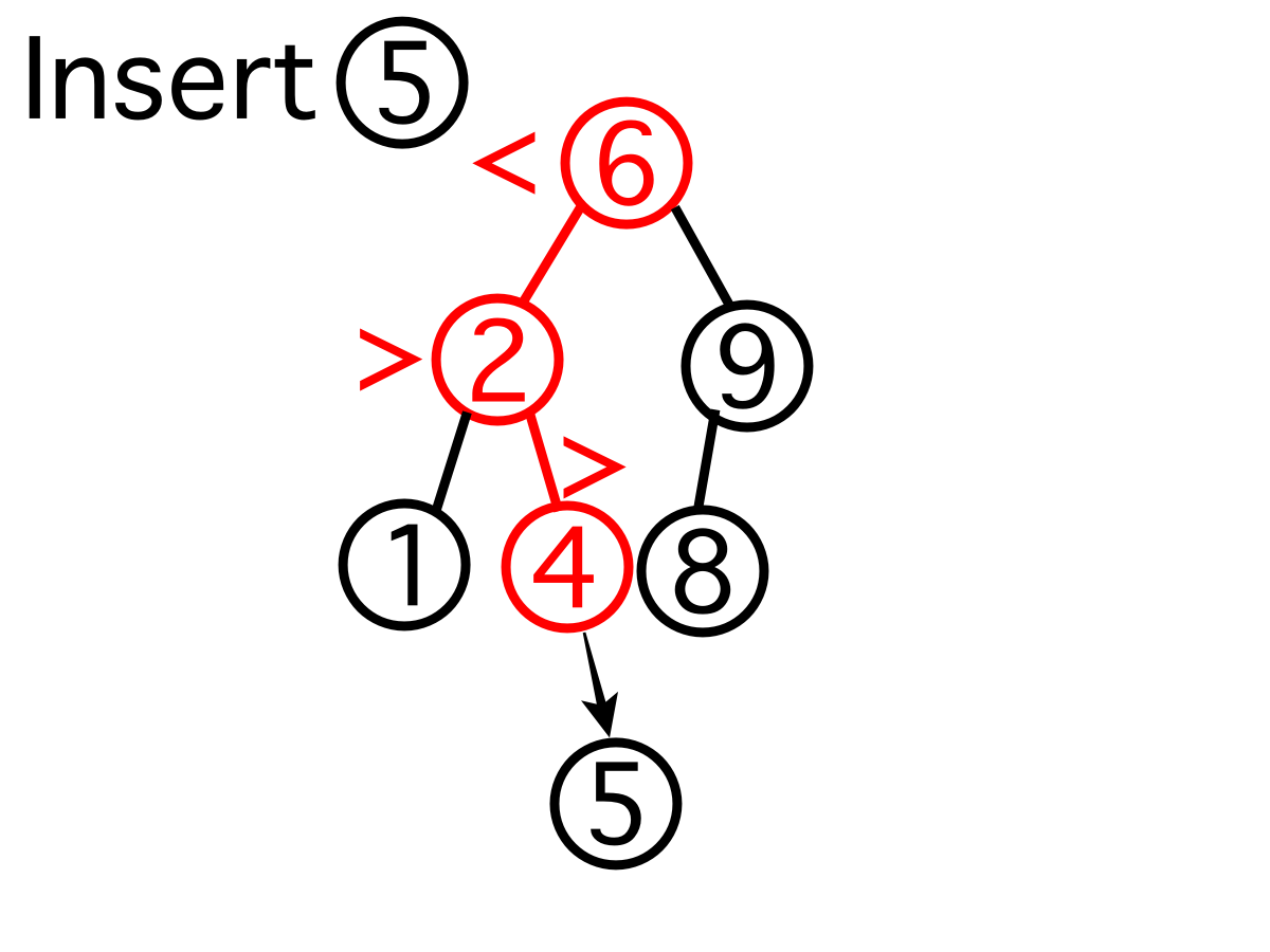 이렇게 탐색과정처럼 루트노드부터 값을 비교하면서 잎새 노드까지 내려간다. 이후 잎새 노드와 비교해서 맞는 자리에 노드를 추가해 주기만 하면 된다.