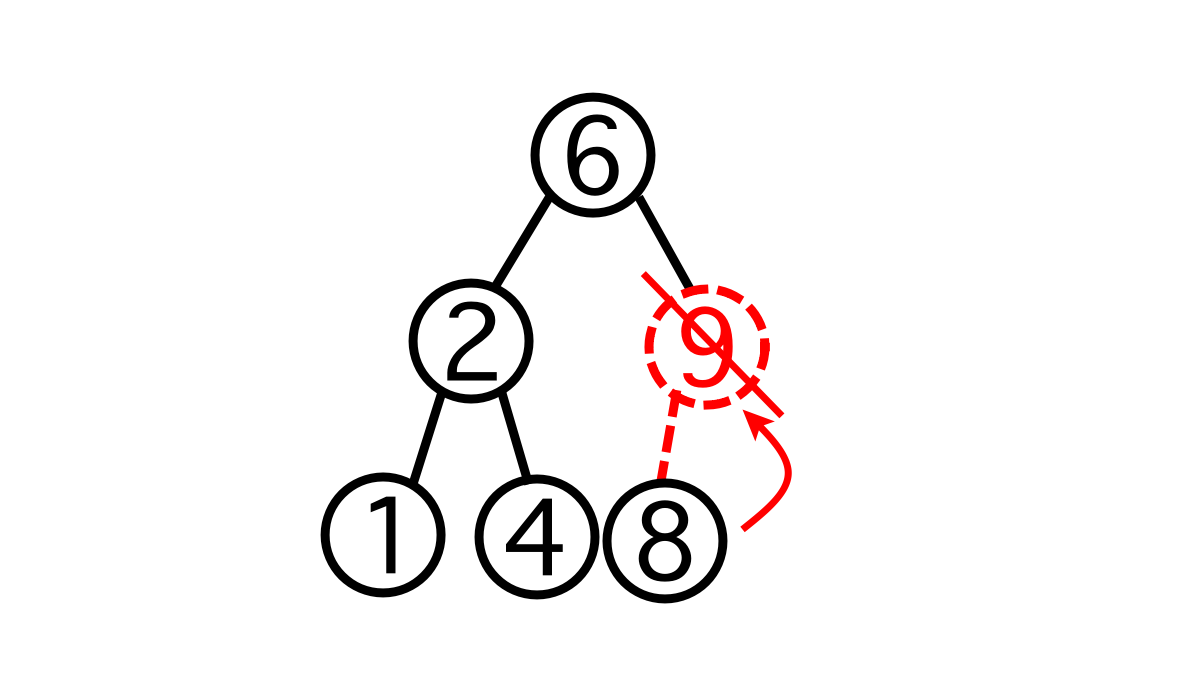 두번째 경우, 삭제할 노드의 자식 노드가 하나 있을 때를 가정하여 9를 삭제한다고 하면,