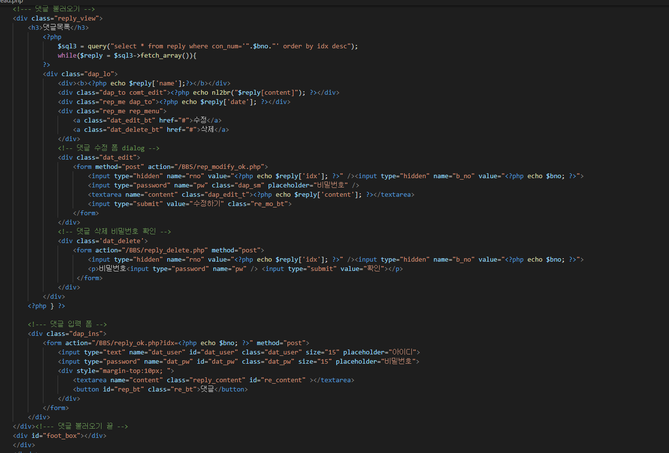 그리고 read.php 하단에 댓글입력을 위한 코드들을 추가해준다. 일단 댓글목록에는 reply테이블에 기존에 있던 모든 댓글을 $bno와 con_num이 일치하는 것들만 가져옴으로써 출력한다. 구체적으로는 $reply 변수에 fetch_array()함수를 통해 각각의 컬럼에 해당하는 정보를 가져오고, dap_io 에서 한줄씩 출력해준다.