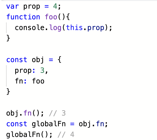 이 예시를 살펴보면, obj.fn으로 호출한 함수의 this는 obj를 가리킨다. 따라서 obj의 prop인 3을 출력한다. 그러나 globalFn은 전역 컨텍스트에 선언되었기 때문에 해당 함수를 호출하면 전역 prop인 4가 출력된다. 같은 foo 함수이지만 어디서 호출되는지에 따라 this는 다른 객체를 가리킨다.