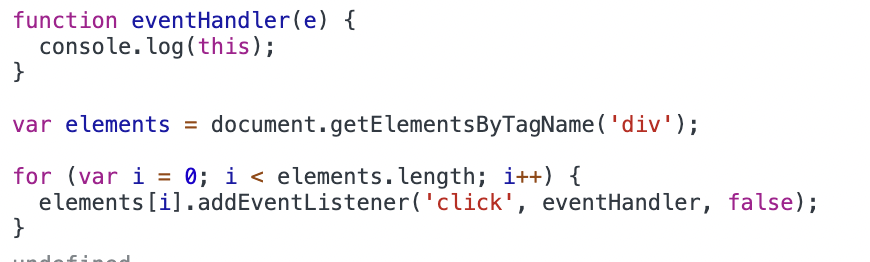 콘솔에서 이런 식으로 모든 div에 이벤트를 걸어준다. 이후 아무데나 클릭해본다.