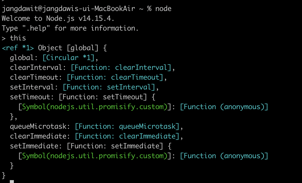 nodejs에서 this를 입력하여 확인해보면, 이렇게 global 객체의 정보가 출력된다.