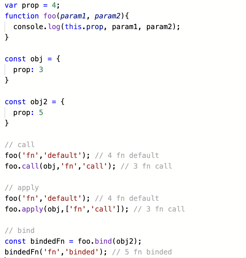 foo 함수의 this는 기본적으로 전역 객체를 가리키고, 따라서 그냥 실행하면 4 fn defalut 가 출력된다. 여기서 call 을 통해 해당 함수의 this를 한번만 바꿔서 실행시킬 수 있다. call 함수의 첫 인자로 this가 가리킬 객체를 주고, 나머지 인자로 원래 해당 함수의 인자를 주면 된다. 예시에서는 obj 객체를 가리키게 해서 3 fn call 이라는 결과를 출력하도록 했다.