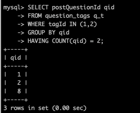 tagId 1 과 2 둘중 하나라도 포함하는 ROW들을 모두 가져온 뒤에 question ID로 GROUP BY를 수행하여 묶은 뒤 ROW가 2개인 qid만 HAVING으로 걸러주면 된다. 여기서는 1과 2밖에 없어서 2개지만 검색하는 태그 갯수만큼 걸러주어야 할 것이다.