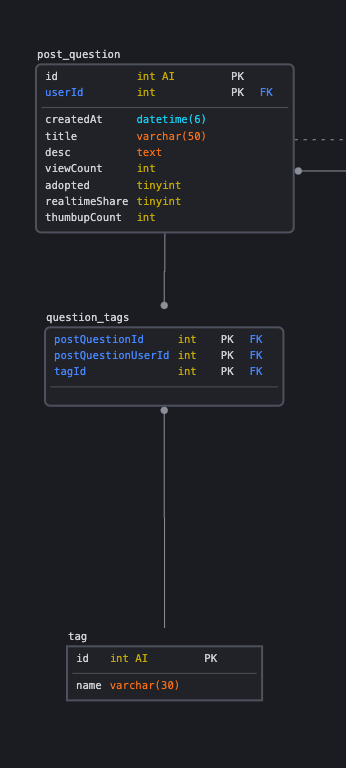 post_question과 tag가 N:M 관계를 가지고 있고, 연결 테이블로 question_tags 를 가지고 있다.