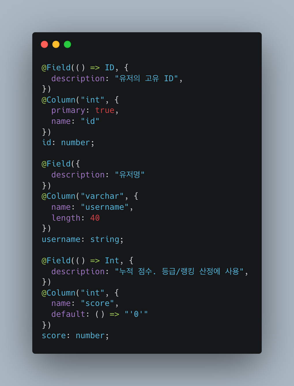 이렇게 데코레이터를 붙여준 것만으로도 벌써 GraphQLObejctType이 된 것이다! 이후에 필드로도 사용할 칼럼 상단에 @Field() 데코레이터를 달아준다.