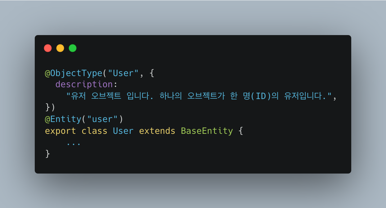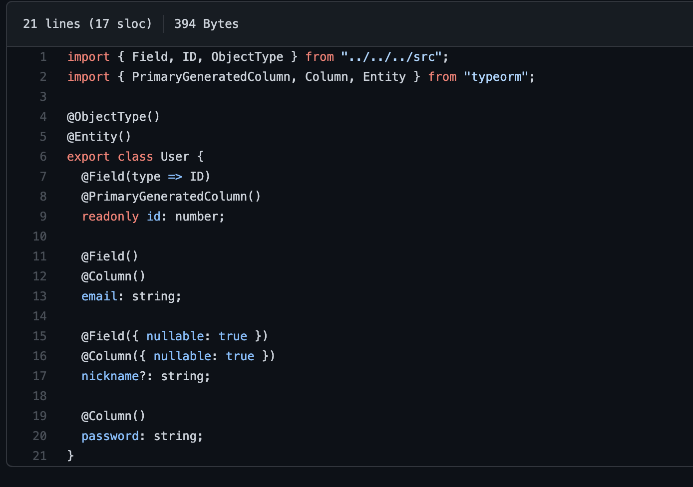 이게 기존 UserType으로 사용하던 GraphQLObjectType이다. 이걸 Entity로 합치기 위해 먼저 ObjectType() 데코레이터를 엔티티 클래스에 붙여준다.