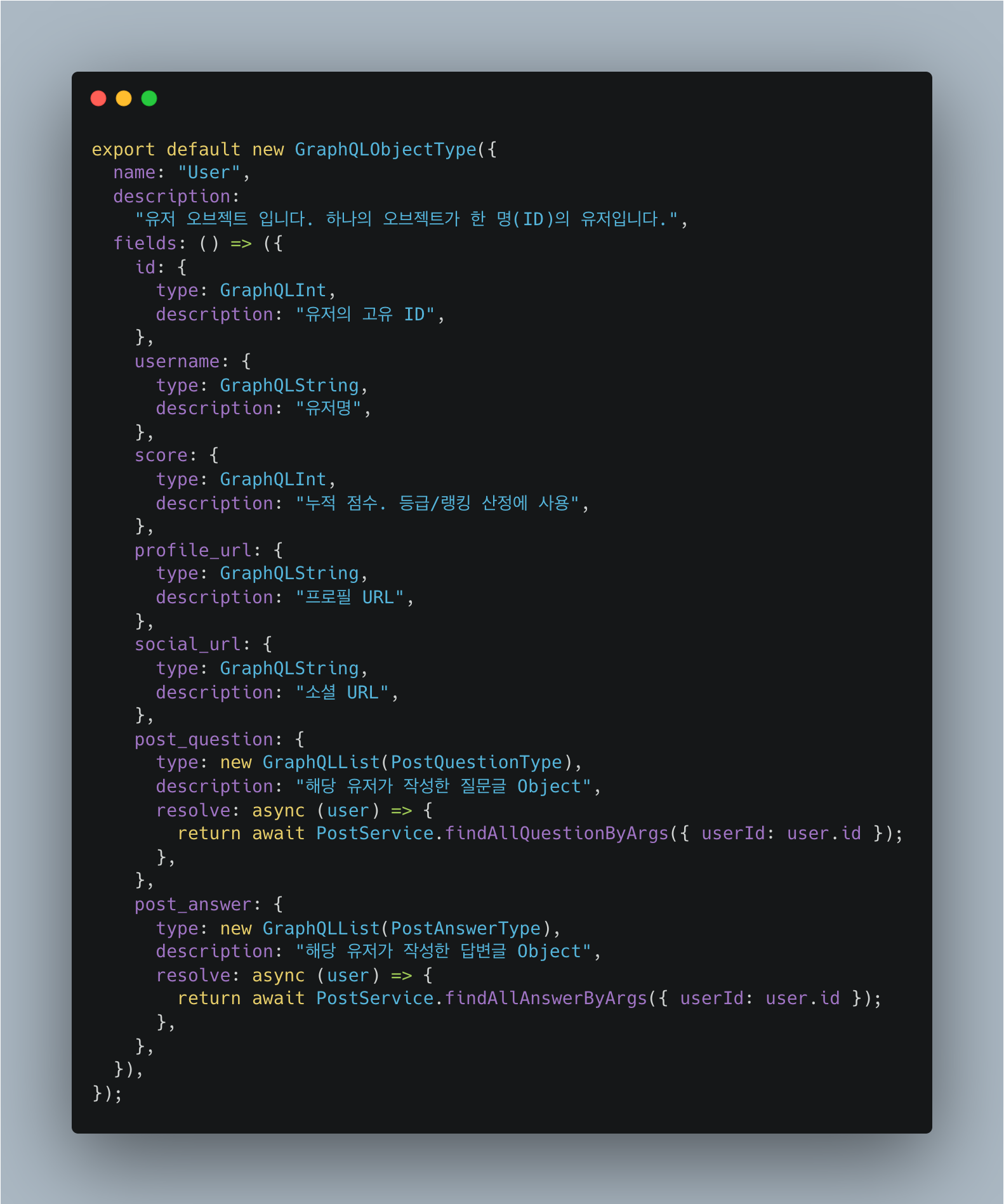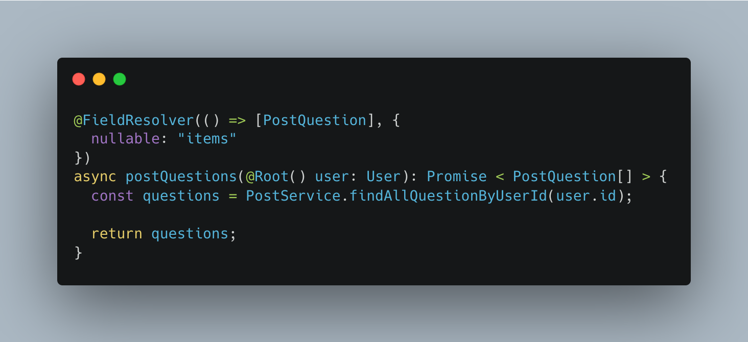 해당 유저가 작성한 질문글 리스트를 필드에 넣었다면, 다음과 같은 코드로 필드리졸버를 구현할 수 있겠다.
