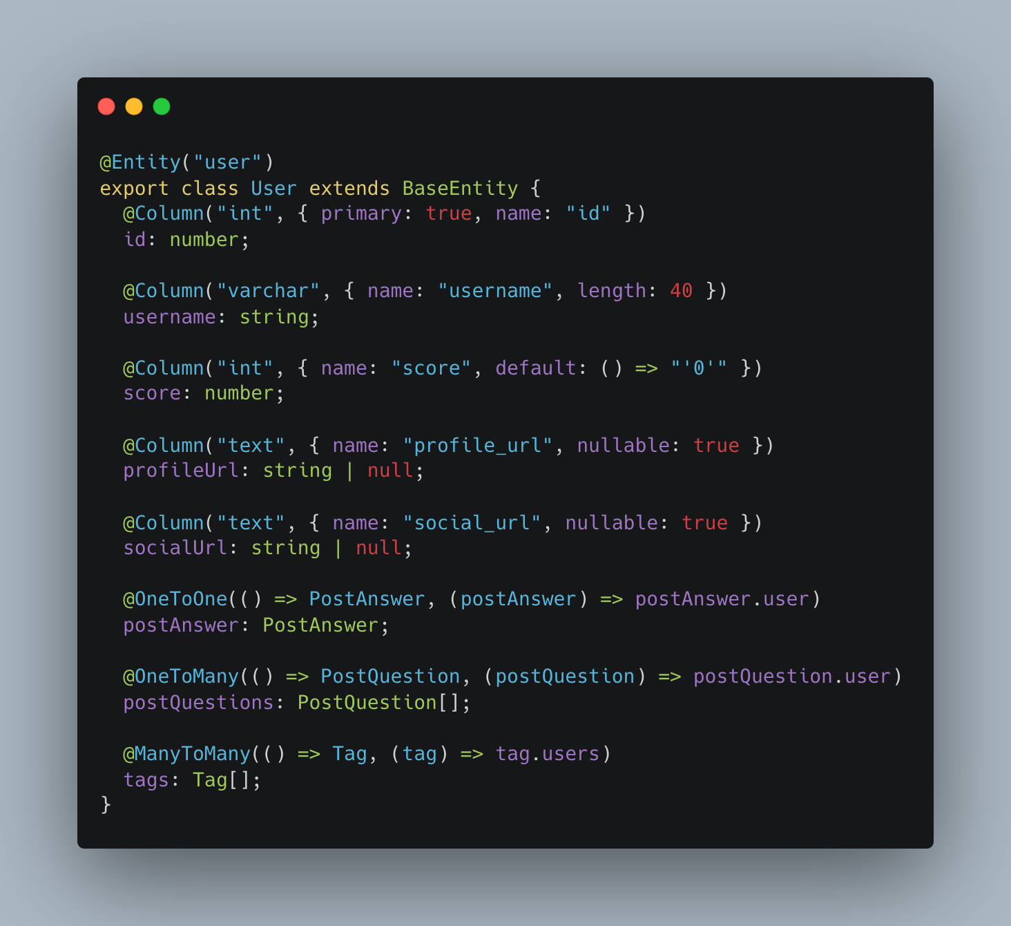 Graphql 의 Object Type 과 TypeORM의 entity는 같거나 거의 유사한 구조를 가지고 있다. 예를 들어 User를 살펴보면,