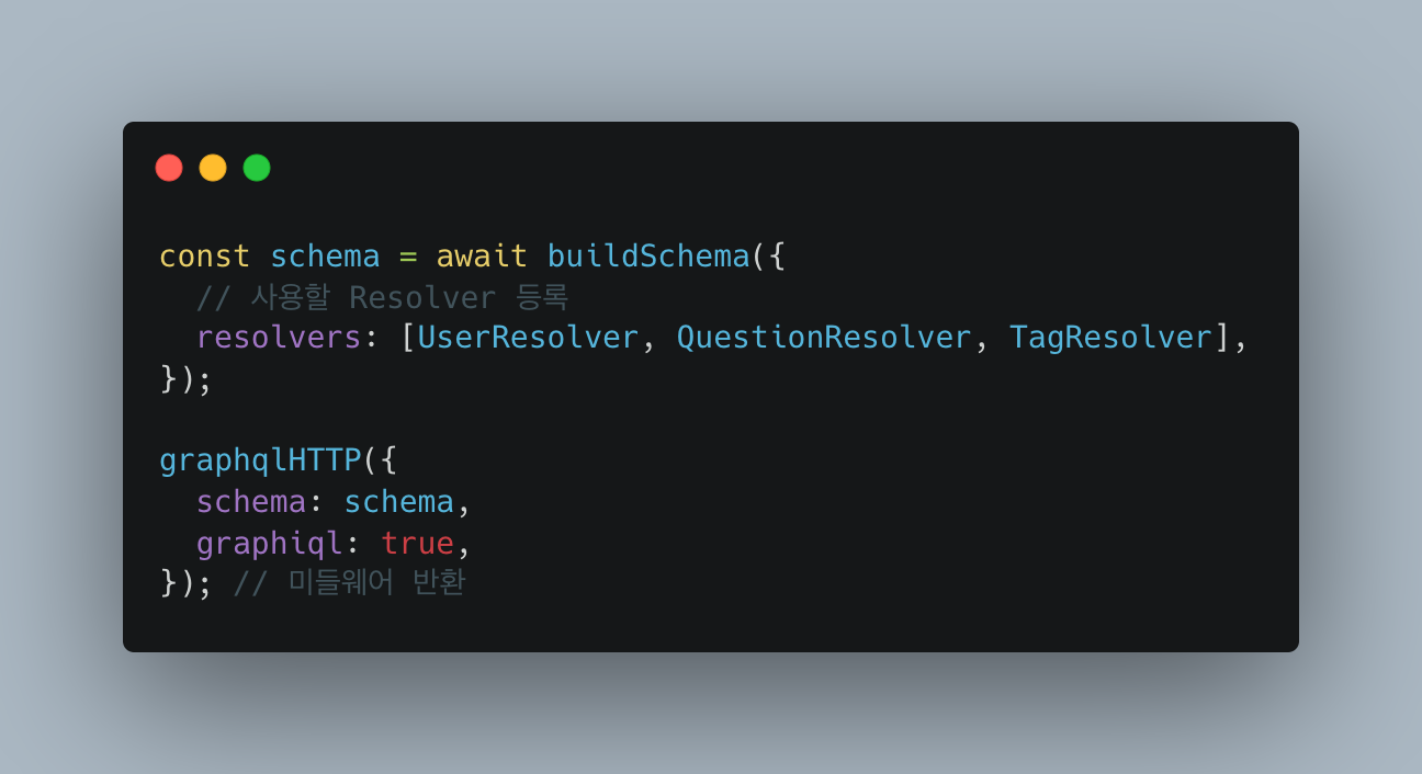 실제로 지금까지 구현한 모든 쿼리와 뮤테이션을 리팩터링 하고, 적용하기 위해서 schema를 만들고, express 미들웨어를 만들기 위해서 buildSchema 함수를 사용한다.