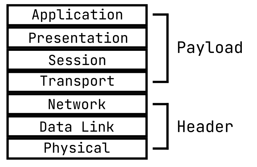 이중 위쪽 4개의 계층은 payload(실제 전송 데이터), 아래 3개의 계층은 header를 포함한다.