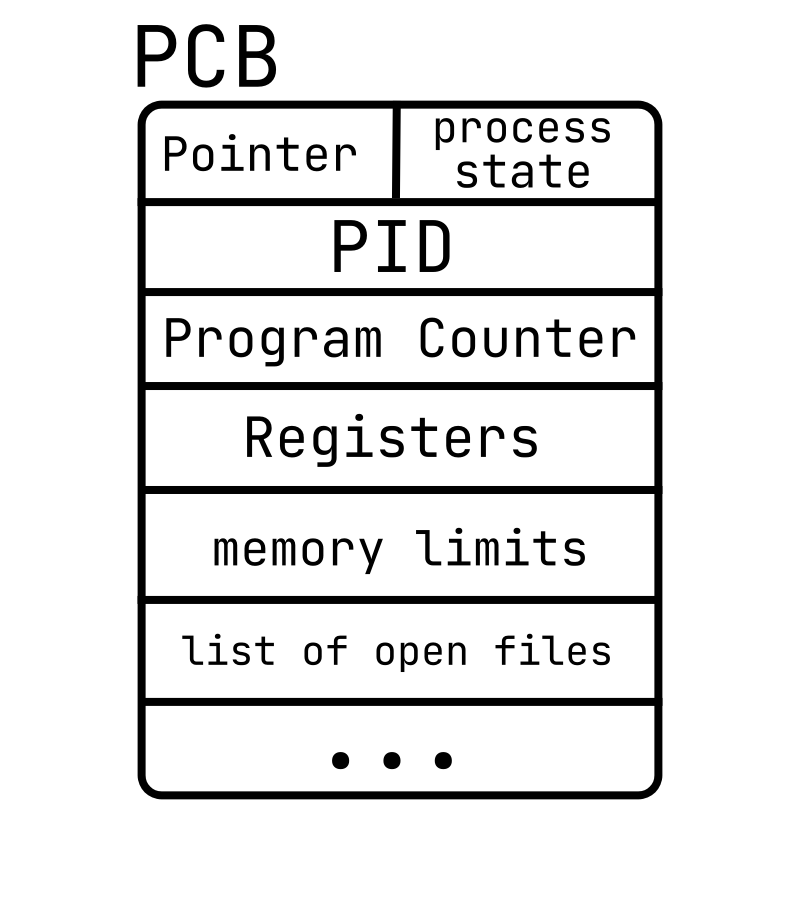 해당 프로세스의 정보들을 저장한다. 이 정보들에는 PID, Pointer, Program Counter, Register 등등이 존재한다.