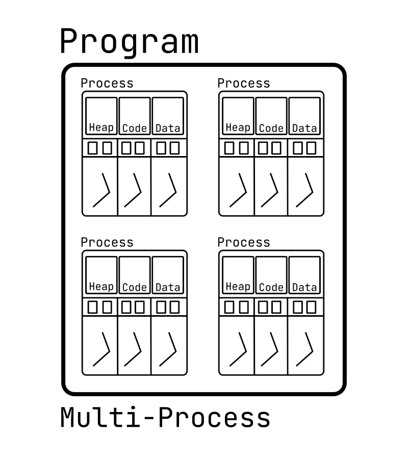 멀티 프로세스는 하나의 응용프로그램을 실행할때 다수의 프로세스를 사용하는 방법이다. 아까 컨텍스트 스위칭에서 프로세스를 교체하는데 오버헤드가 많이 발생한다고 했는데 왜 굳이 멀티 프로세스를 사용하는가 하면, 이는 안정성 때문이다. 하나의 프로그램에서 하나의 프로세스만을 사용한다면 속도는 빨라질 수 있겠지만 만약 그 프로세스에서 오류가 난다면 전체 프로그램이 죽어버리게 된다. 그러나 멀티 프로세스로 하나의 프로그램을 다수의 프로세스로 돌리게 된다면 그중 하나의 프로세스에서 오류가 발생한다고 하더라도 다른 모든 부분이 죽는 상황은 피할 수 있는 것이다.