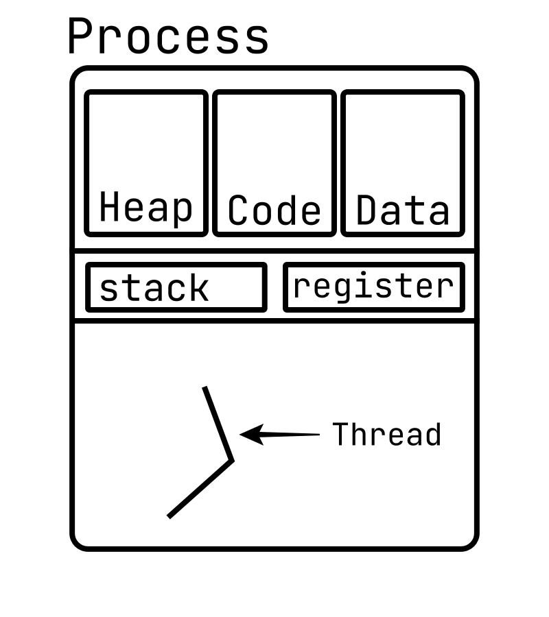스레드란, 프로세스 내에서 즉 하나의 프로그램 내에서 나뉘어진 작업의 단위, 흐름(스레드는 '실'이라는 뜻을 가지고 있다)이다. 프로세스 내에서 스레드는 각각 Stack영역만을 할당받고, 나머지 Code, Data, Heap영역은 프로세스 내에서 서로 공유한다.