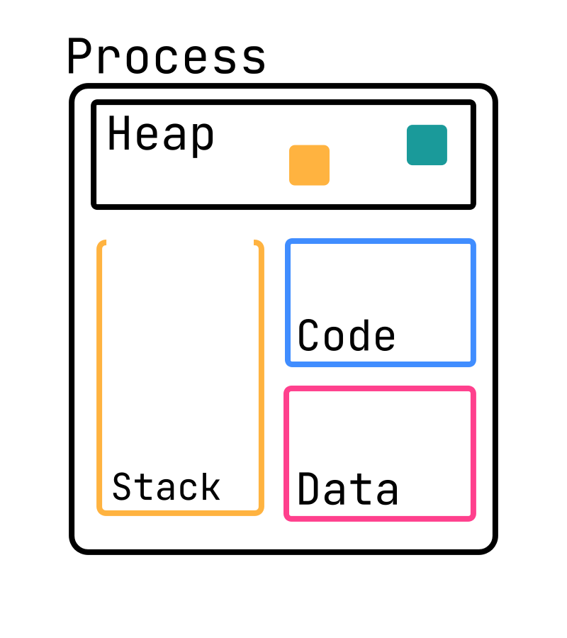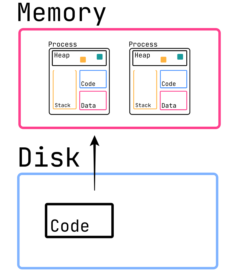 프로세스란, 실행된(실행되고 있는) 프로그램을 의미한다. 이 프로세스 단위로 OS에서 시스템 자원을 할당받게 된다. 구체적으로 프로세스는 각각 Code영역, Data영역, Stack영역, Heap영역을 할당받는다. 이 프로세스들은 서로 독립된 메모리 영역에 있기 때문에 다른 프로세스에 접근하기 위해서 IPC(Inter-process communication)를 사용해야 한다.