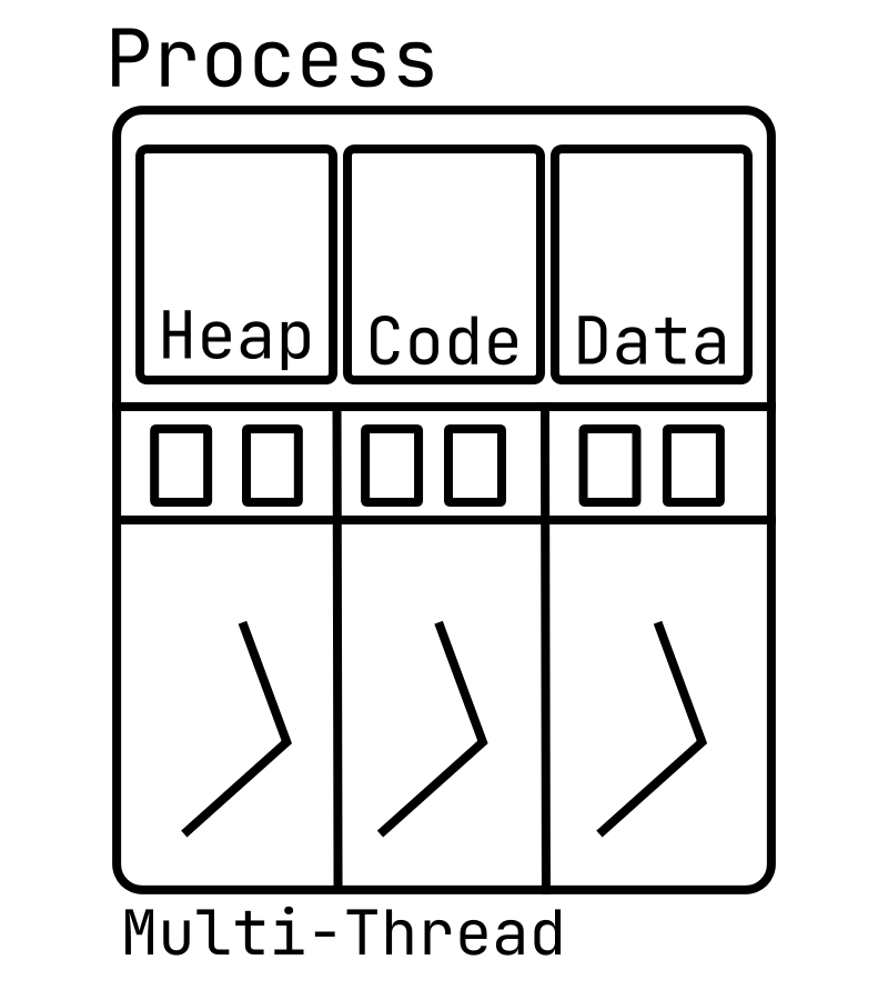 한 프로그램을 실행한다고 해도, 그 프로그램 내에서 다양한 작업을 수행해야 한다면 당연히 다수의 스레드가 필요할 것이다. 이렇게 하나의 응용프로그램을 실행할때, 하나의 프로세스 안에서 다수의 스레드를 사용하는 방법을 멀티 스레드라고 이야기한다. 멀티 스레드는 Code, Data, Heap영역을 공유하기 때문에 메모리를 효율적으로 사용할 수 있다.