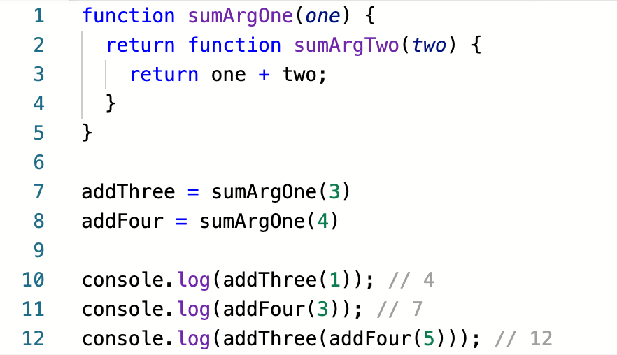 방금 함수가 리턴과 함께 닫히긴 하더라도, 그 어휘적 환경은 가지고 있는다고 했다. 따라서 위와 같이 처음에 인자를 주고 해당 인자를 저장하는 다른 함수를 만든 뒤, 이를 사용하는것도 가능하다.