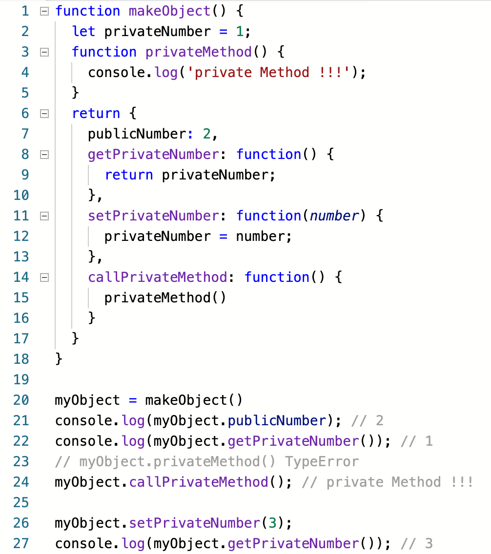 상단 예제에서 makeObject 함수는 자기 자신의 스코프로써 privateMethod와 privateNumber를 가지고 있다. 그리고 Object literal으로 하나의 오브젝트를 반환하고 있는데, 해당 오브젝트에서는 publicNumber와 set, get 메서드가 보인다.