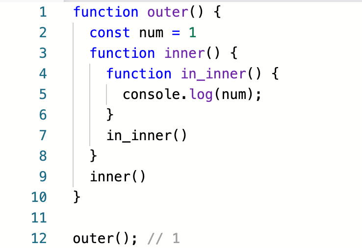 실제로 실행해보면, 1을 정상적으로 뱉는것을 볼 수 있다. 이것이 바로 클로저다. outer 함수는 inner 함수를 반환함으로써 닫혔(Closed) 지만, 그렇다고 해서 자신이 가지고 있던 어휘적 환경(Lexical Scope) 까지는 없애지 않는다.