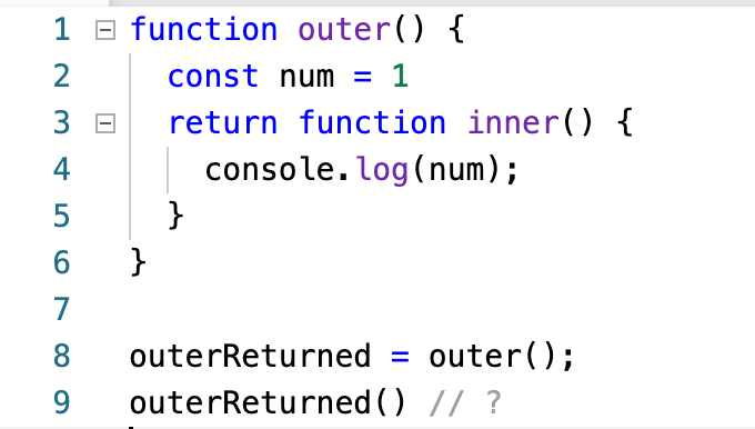 outer 함수는 inner 함수를 선언 및 반환하는데, 논리적으로 생각했을때 outer 함수가 리턴한 후에는 outer 함수 스코프에 있던 num 변수는 없어지고 함수를 호출하면 Error를 뱉지 않을까?