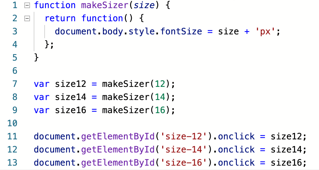 프론트엔드에서 DOM 요소에 이벤트를 부여할 때, 이벤트 핸들러 함수를 넘기게 된다. 여기에서는 글자 크기를 변경하는 예시를 들고 있다. body의 글자 크기를 할당하는 함수를 반환하는 함수를 정의하고, 각각 12, 14, 16 px에 대해서 함수를 만들어 핸들러로 등록하고 있다.