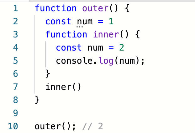 자바스크립트에서 상단과 같은 코드가 있다고 할때, 콘솔에는 2가 찍힌다는것을 쉽게 예측할 수 있다. 기본적으로 함수는 자신의 스코프 내에서 변수를 찾기 때문이다. 그렇다면 여기서 inner 함수의 내부에 있는 num을 삭제하면 어떻게 될까?